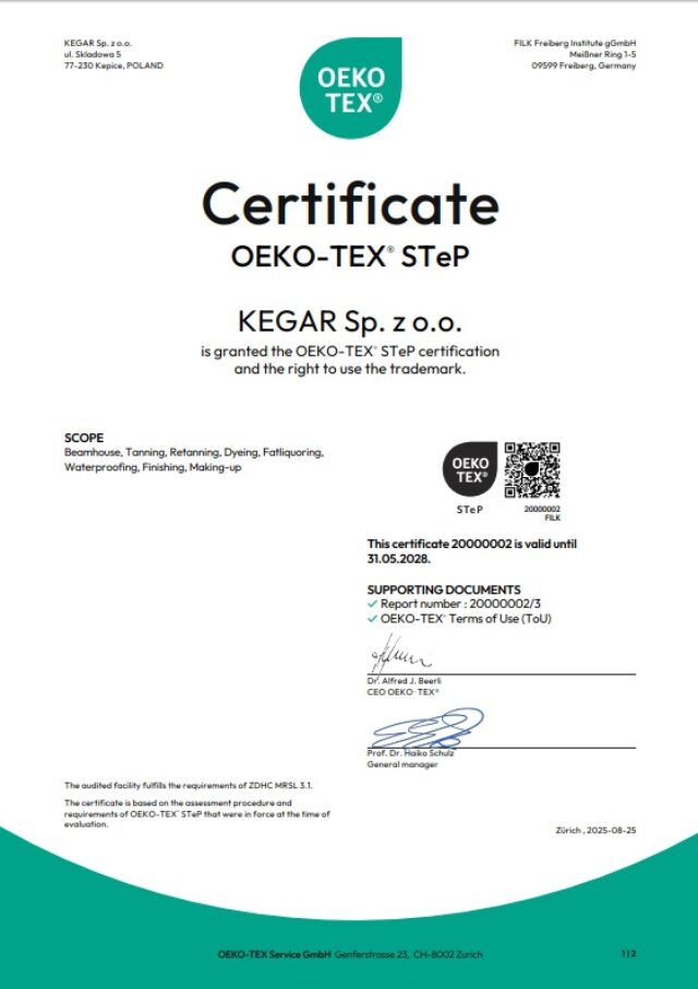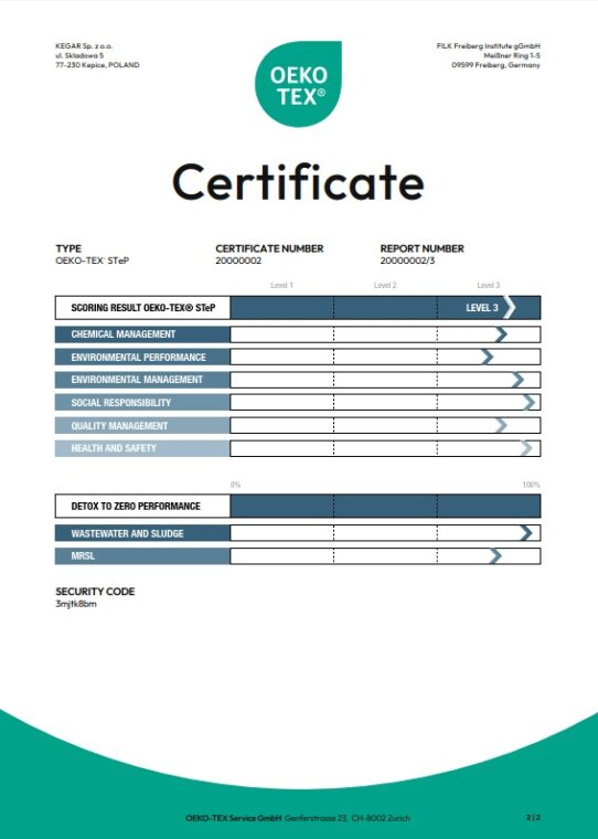 … 27 kwietnia 2022 spółka Kegar przeszła audyt STeP by OEKO-TEX® i zakończyła tym samym pomyślnie proces certyfikacji. Ten modułowy system certyfikacji dla zakładów produkcyjnych branży tekstylnej i skórzanej analizuje w 6 modułach wszystkie najistotniejsze obszary firmy: zarządzanie chemikaliami, efektywność środowiskowa, zarządzanie środowiskiem, odpowiedzialność społeczna, zarządzanie jakością oraz bezpieczeństwo i higiena pracy. [13]
